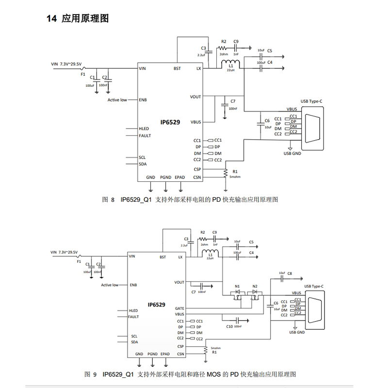 IP6529_Q1采用同步开关降压架构,内置功率MOS管,可减少外部元件数量,简化电路设计。其QFN24(4mm×4mm)封装体积较小,有助于节省PCB空间。同时,较高集成度设计有助于降低BOM成本。此外,芯片支持I²C接口,可与外部MCU通信,实现电压、电流、PDO等参数的读取与配置,为充电管理提供便利。