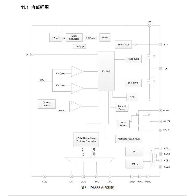 IP6565支持USB PD3.0(含PPS)、QC2.0/QC3.0、华为FCP/SCP、三星AFC、苹果2.4A等主流快充协议,覆盖iPhone、安卓手机、平板等多种设备。其PPS功能支持3.3V–11V范围内20mV/步进的电压调节,有助于优化充电过程。例如可为三星Galaxy S23 Ultra提供9V/3A约28.95W输出,为iPhone 15 Pro Max提供9V/2.22A约20W输出。