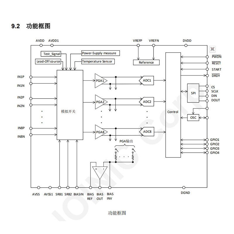 IPA1299是一款8通道低噪声24位同步采样Δ-Σ模数转换器(ADC)芯片,适用于颅外脑电图(EEG)、心电图(ECG)及肌电图(EMG)等应用。其技术特点主要体现在以下方面: