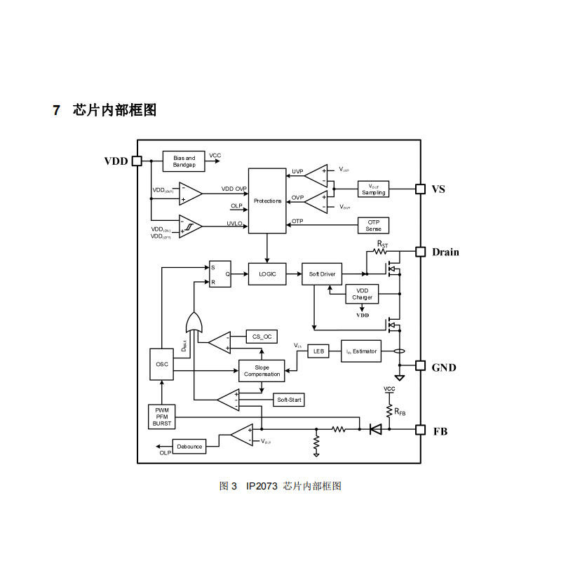 IP2073_13H内置输出欠压保护、VDD过压保护、过温保护及带补偿的过功率保护等多重保护机制。这些机制可在电路异常时及时响应,帮助保护芯片及外围元件,支持系统长期稳定运行。其中过温保护有助于防止因温度过高引起的性能下降或损坏,提升产品的可靠性。