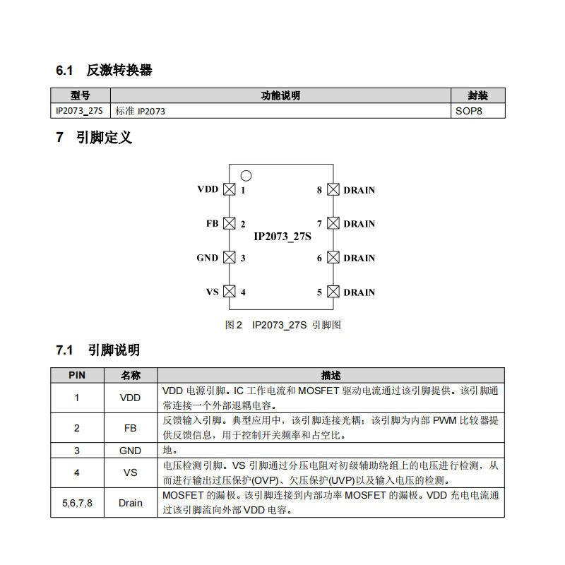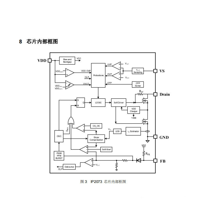 IP2073内置多种保护功能,以应对不同工作条件下的异常情况。输出侧支持过压保护(VS_OVP)和欠压保护(VS_UVP);电源端具备VDD过压保护(VDD_OVP);过温保护(OTP)通过内部温度检测实现,温度异常时自动关闭MOSFET;过功率保护(OLP)具备补偿特性,可适应不同负载条件,防止过载损坏。