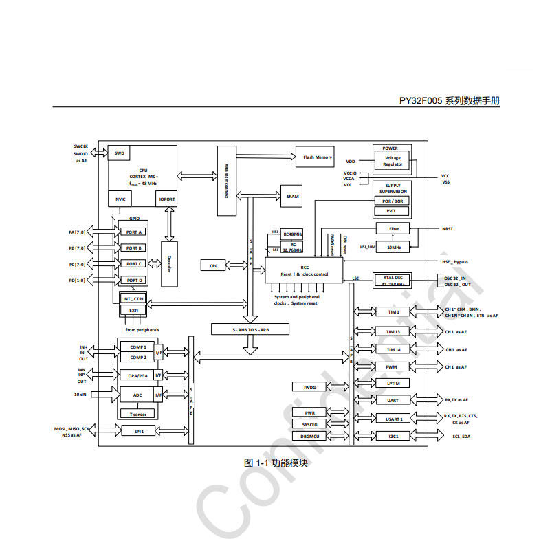 普冉PY32F005搭载32位ARM Cortex-M0+内核,主频可达48MHz,可支持复杂的控制算法和实时性较高的数据采集任务。