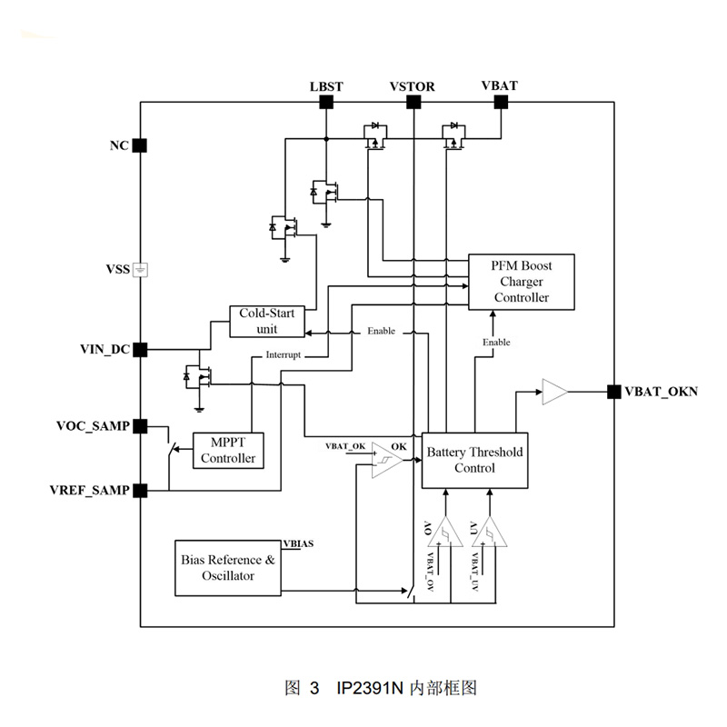 芯片内置电池欠压保护(UVLO)与可编程过压保护(OVP),阈值覆盖3.7V至4.3V,支持3.4V至3.7V的电量低阈值指示。通过VBAT_OKN门级驱动信号,可在电池电压过低时自动断开系统负载,防止过放损坏。此外,IP2391N支持将能量存储于锂电池、薄膜电池、超级电容器或传统电容器,适配不同应用场景的储能需求。