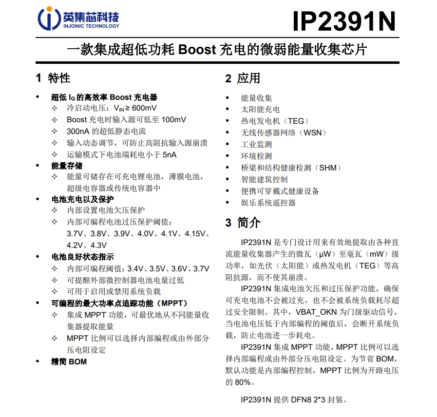 对比BQ25504,IP2391N在功耗控制上更进一步,且支持更宽的输入电压范围(100mV-5.5V),尤其适合光伏、TEG等非稳态能量源的采集需求。