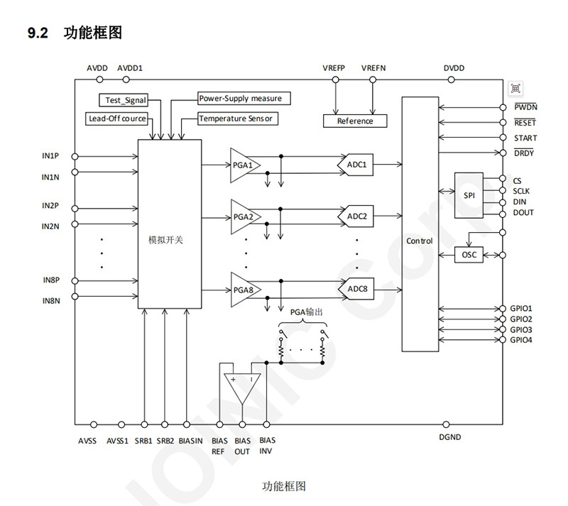 IPA1299完全兼容TI公司ADS1299的引脚定义(pin to pin),功能覆盖ADS1298的全部特性,支持250SPS至16kSPS采样率,集成可编程增益放大器(PGA)、内部基准和振荡器。设备厂商无需修改原有电路设计,即可直接替换进口芯片,大幅缩短研发周期。