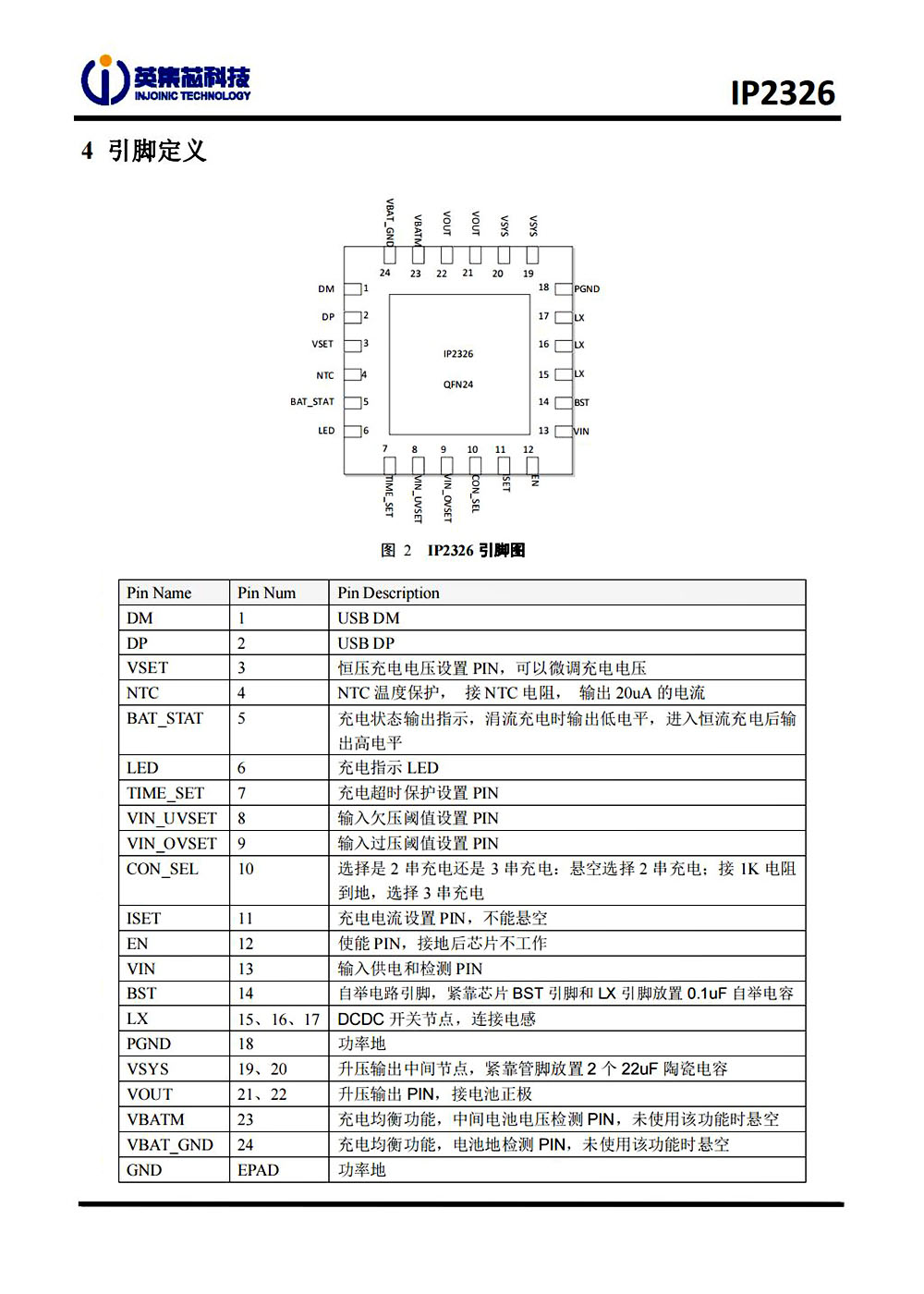 在高温工业环境中,IP2326的NTC温度检测功能可实时监测电池温度,当温度超过阈值时立即停止充电,防止热失控;在电动工具连续作业场景中,其充电超时保护可避免电池过充,提升设备可靠性。