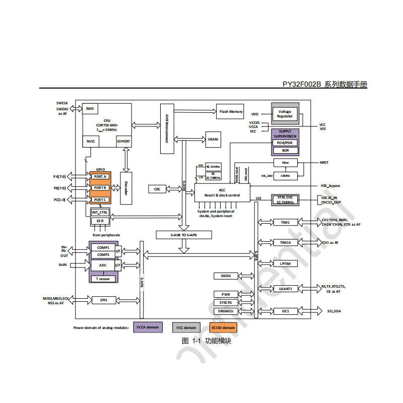 在存储方面,PY32F002B内置24KB Flash存储器,可用于存放程序代码及基本应用算法,满足一般存储需求。同时,芯片配备3KB SRAM,作为运行时的数据缓存区,有助于提高数据访问与处理效率。