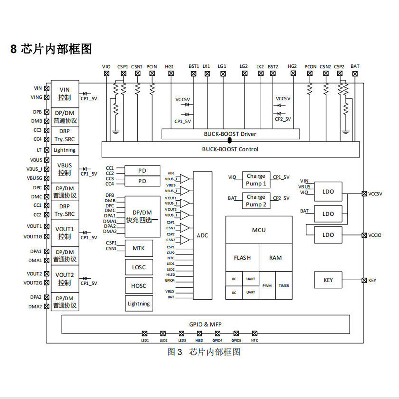 芯片支持2-6节串联电池组,输入/输出功率可达100W,可为笔记本、平板等大功率设备快速充电。动态功率分配技术可根据设备需求自动调节电流,避免过载或功率浪费,提升能源利用效率。